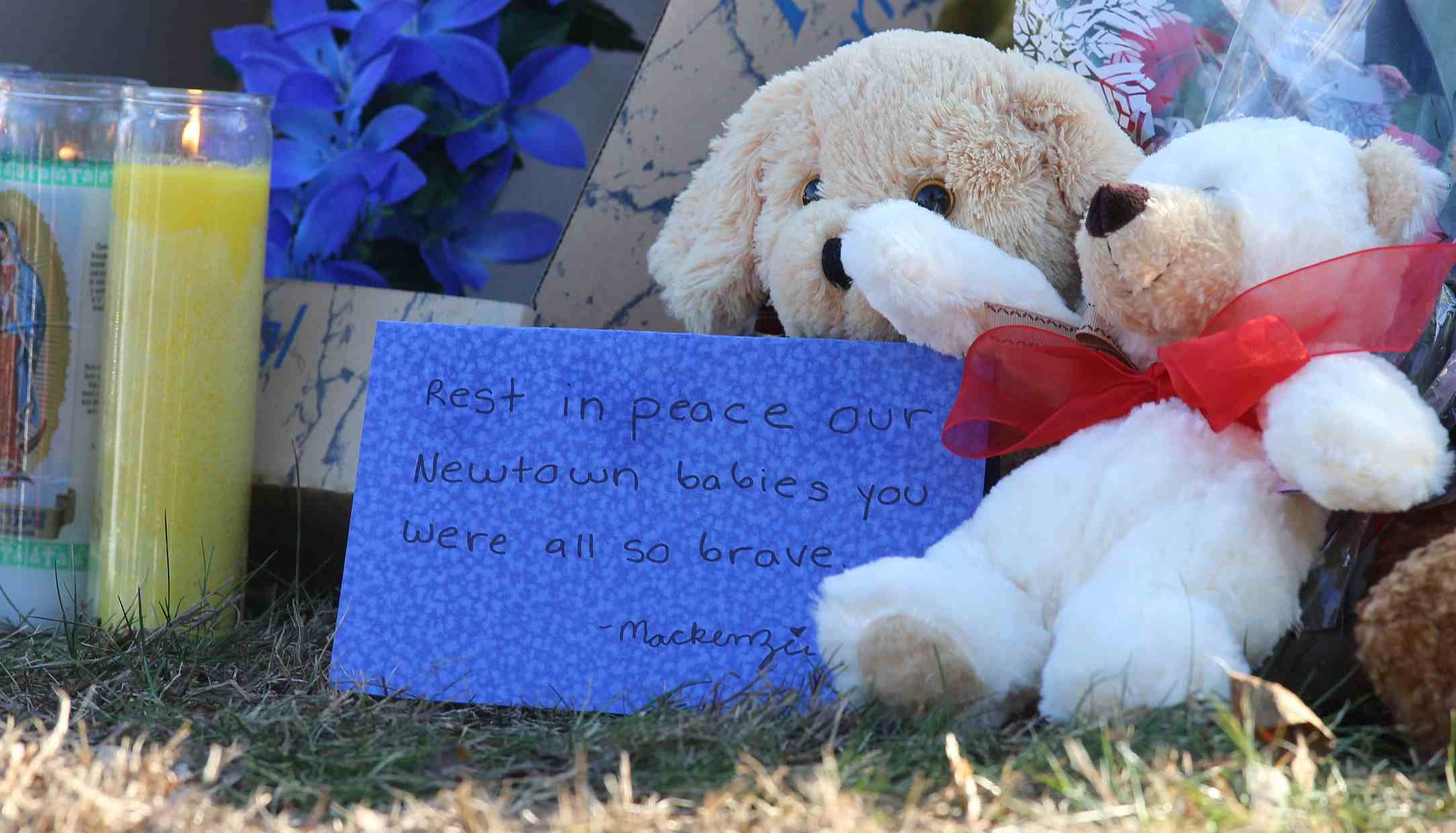 A message and stuffed toys are pictured at a makeshift shrine after the shooting at Sandy Hook elementary school in Newtown, Connecticut, December 15, 2012. /VCG Photo
