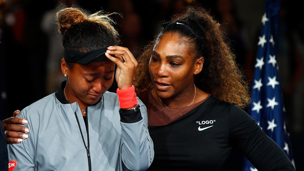 A tearful Naomi Osaka being congratulated by Serena Williams following her 2018 US Open triumph at the USTA Billie Jean King National Tennis Center on Sept. 8, 2018. /VCG File Photo