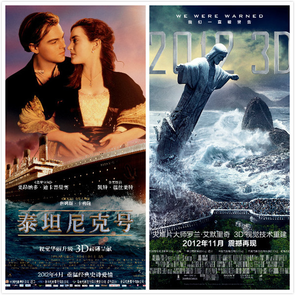 Posters of the 3D version of "Titanic" and "2012". /Photo via thepaper.cn