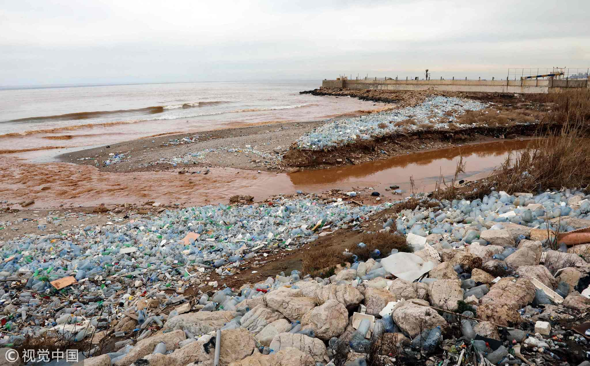 Plastic bottles litter the Ghadir River bed as it pours into the Mediterranean Sea. /VCG Photo