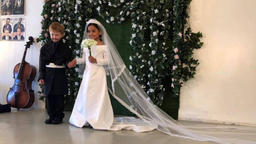 As the bride, Naiyah Otero, 7, wore a version of Markle’s boat-necked Givenchy wedding gown as interpreted by Esaie Couture.