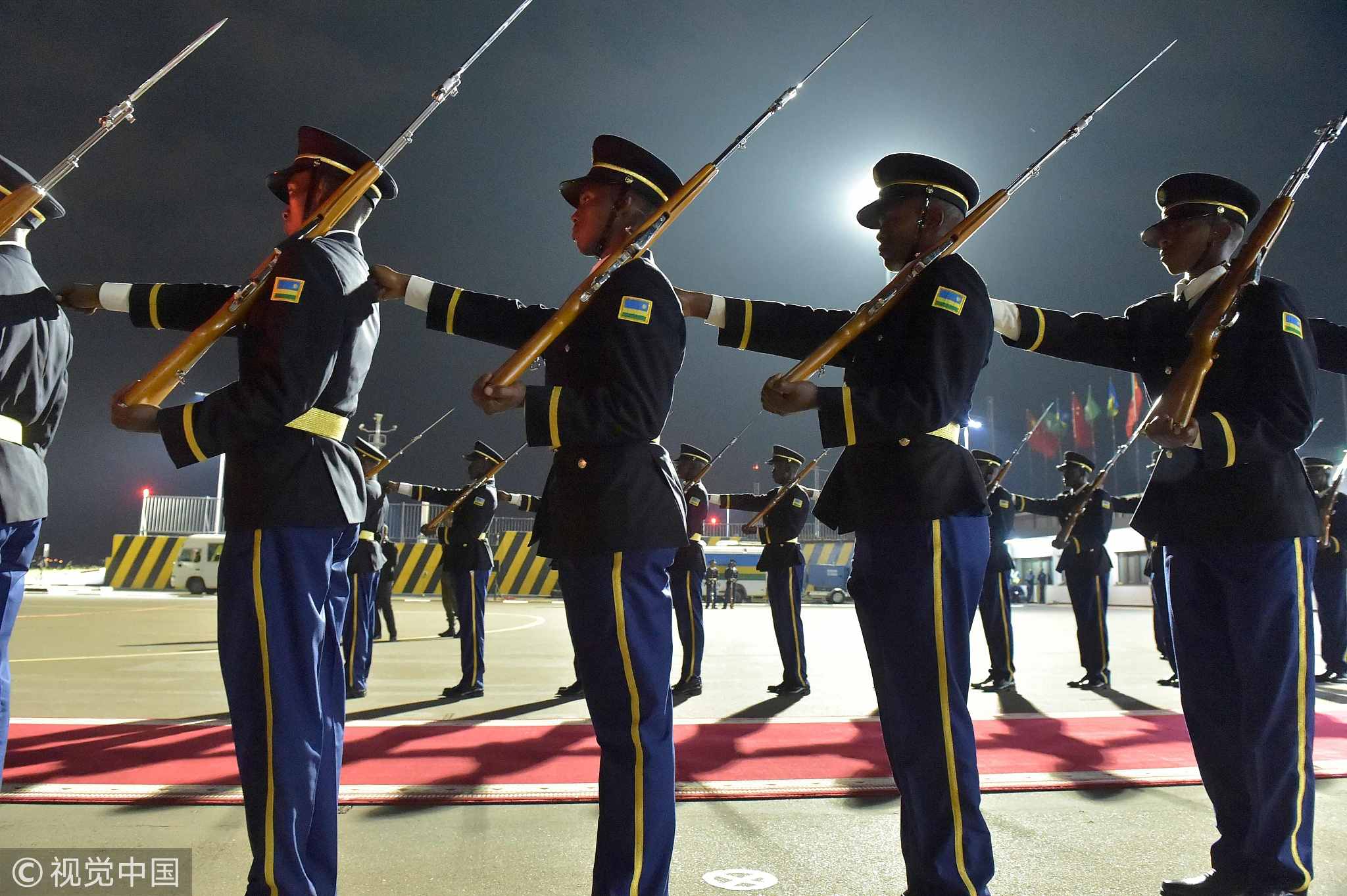 Rwandan military guards stand before Chinese President Xi Jinping and his wife arrived in Kigali for a two-day state visit in Rwanda on July 22, 2018. /VCG Photo