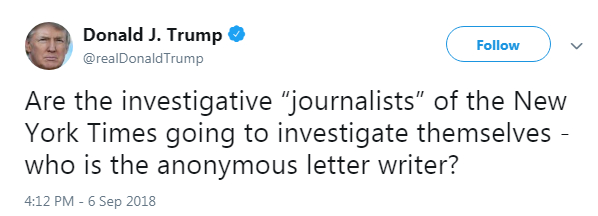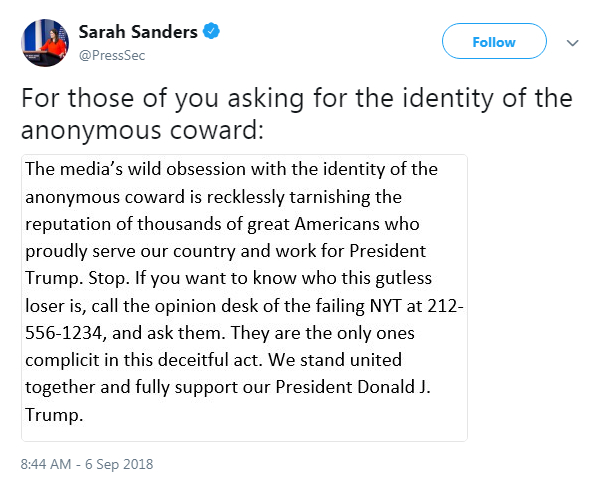On Wednesday night, Trump tweeted a demand that if "the GUTLESS anonymous person does indeed exist, the Times must, for national security purposes, turn him/her over to the government at once!" White House press secretary Sarah Huckabee Sanders called on the "coward" who wrote the piece to "do the right thing and resign."