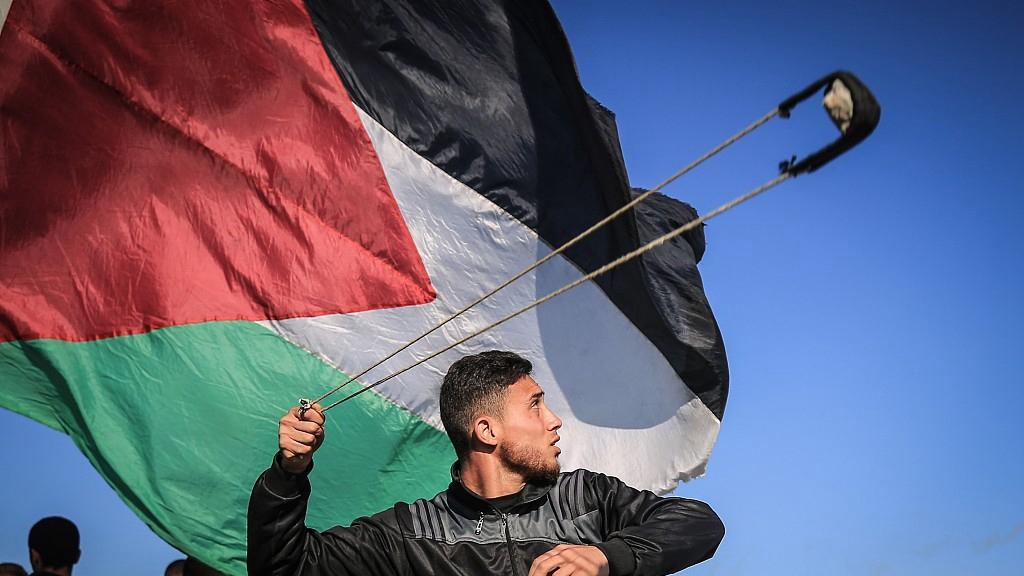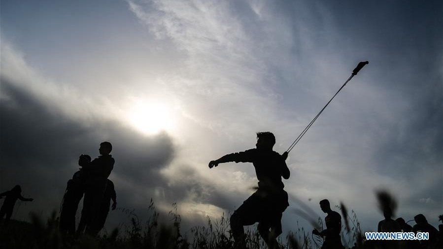 A Palestinian protester uses a slingshot to hurl stones at Israeli troops during clashes on the Gaza-Israel border, east of Gaza City, March 29, 2019. /Xinhua Photo