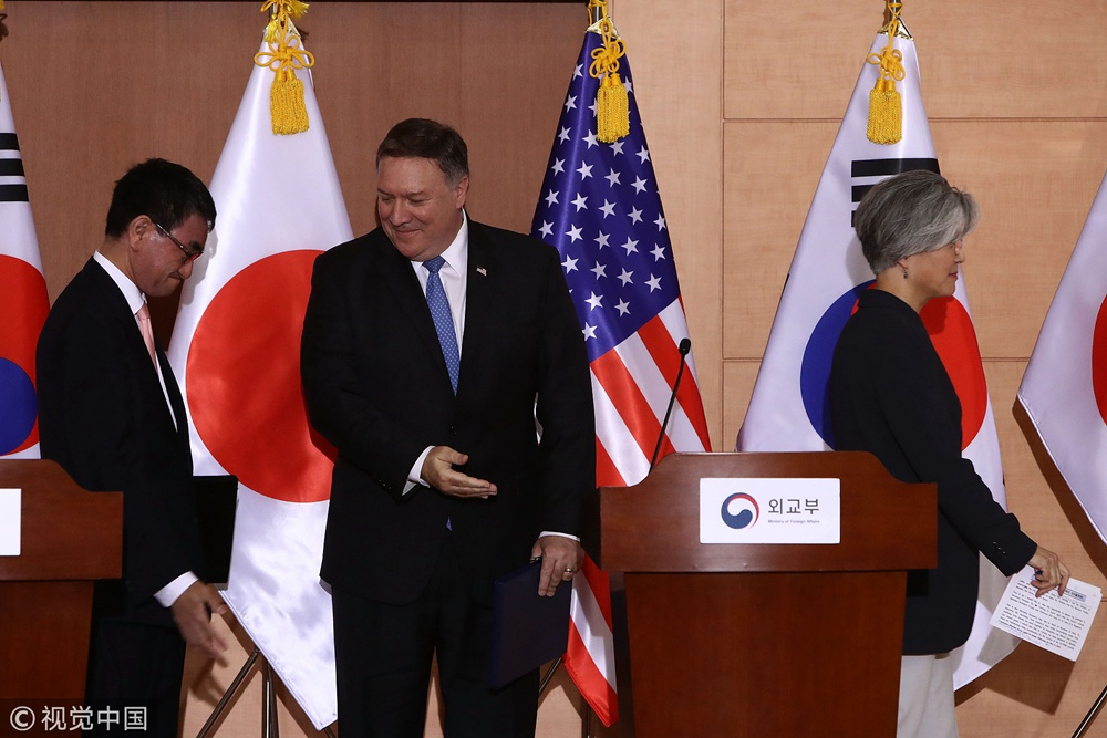 US Secretary of State Mike Pompeo (C), South Korean Foreign Minister Kang Kyung-wha (R) and Japanese Foreign Minister Taro Kono (L) leave after a joint press conference in Seoul, South Korea, June 14, 2018. /VCG Photo