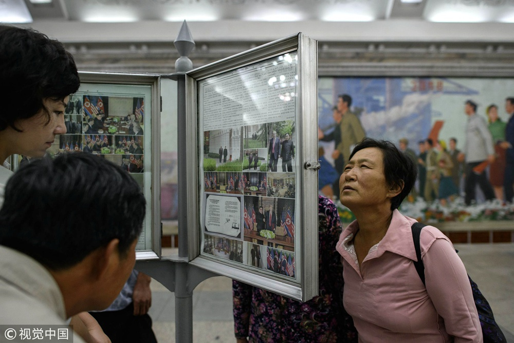 Commuters read the Rodong Sinmun newspaper showing images of DPRK leader Kim Jong Un meeting with US President Donald Trump in Singapore, at a newsstand on a subway platform of the Pyongyang metro, June 13, 2018. /VCG Photo