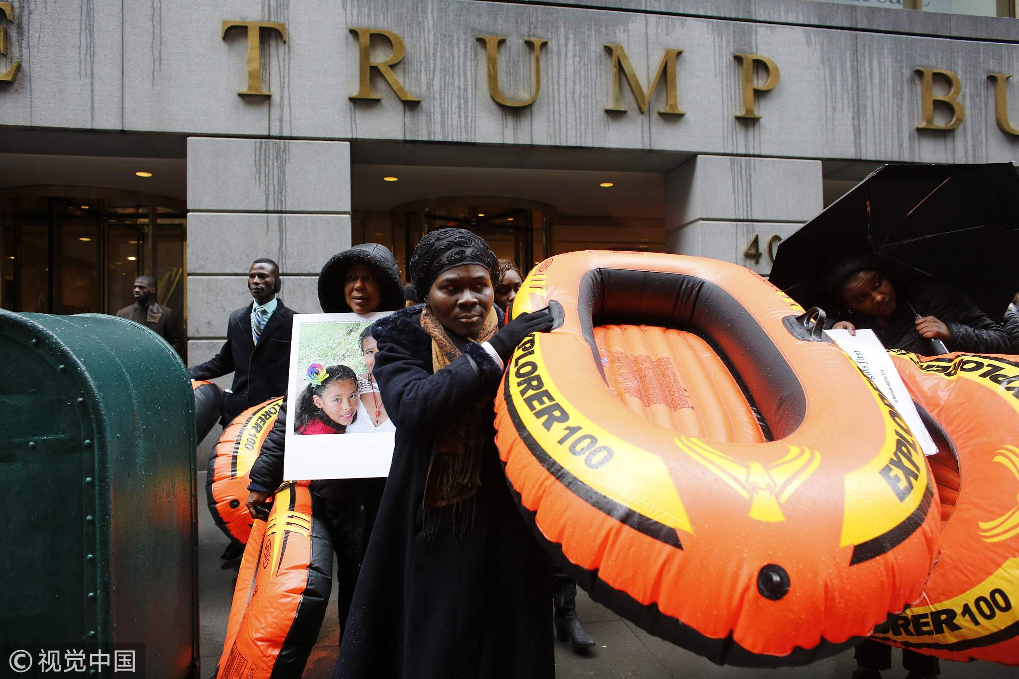 A refugee woman from Africa carries a raft as she takes part in a protest against the US refugee ban outside The Trump building on March 28, 2017, in New York. /VCG Photo.
