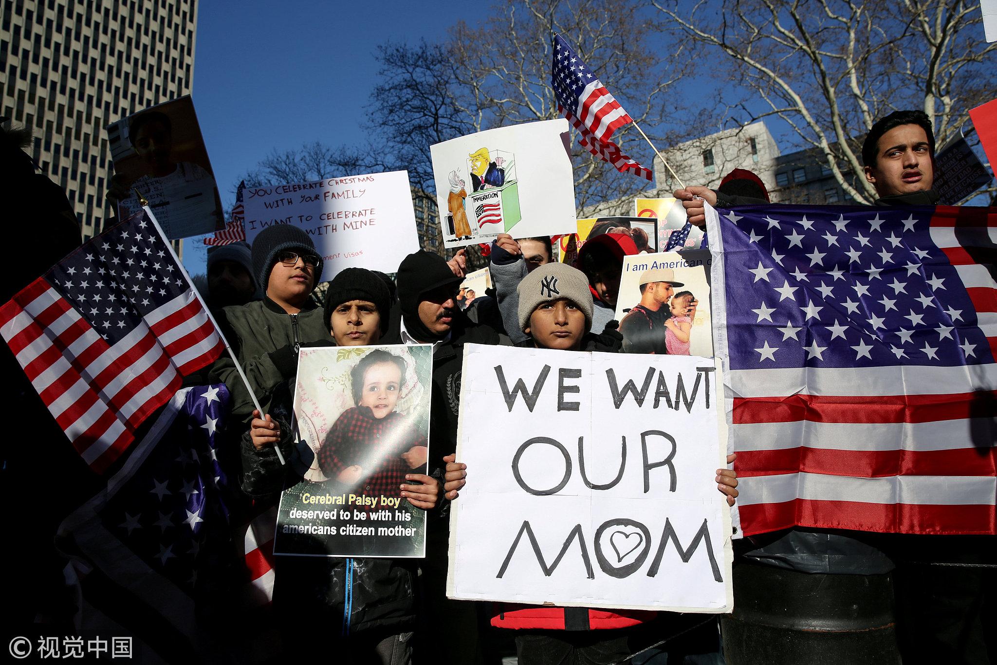 New York Yemeni Americans demonstrate in response to US President Donald Trump's travel ban and recent denials of visa applications in Foley Square in lower Manhattan in New York City, New York, December 27, 2017. /VCG Photo.