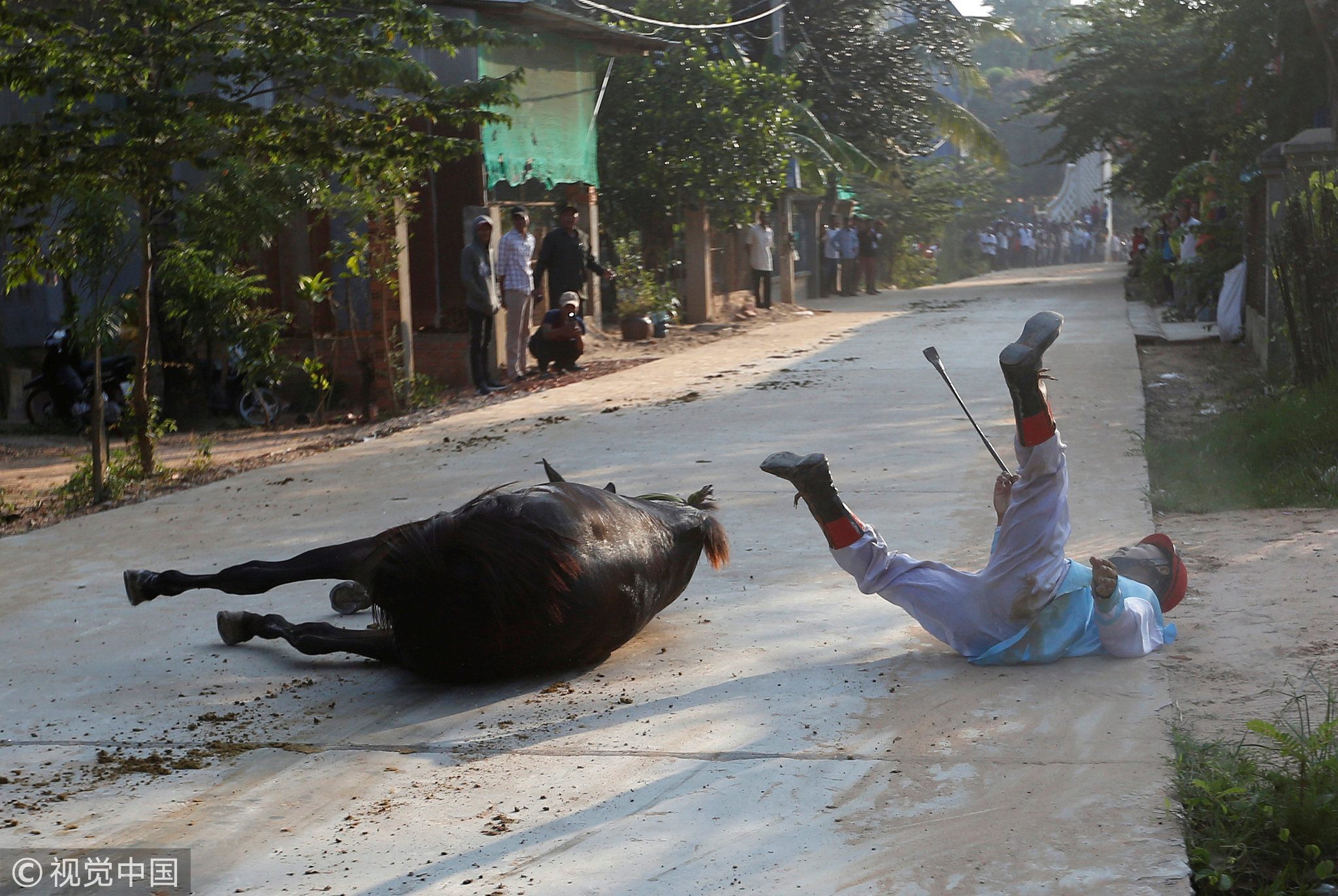 Falling from a horse during Pchum Ben festival. /VCG Photo