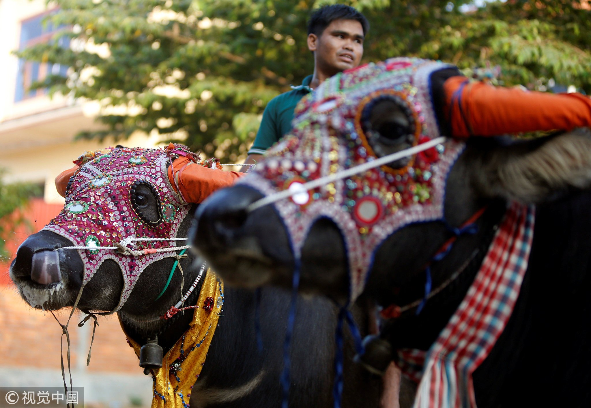 With their heads and horns covered in sparkling decorations, water buffalos were raced at Vihear Sour pagoda in Cambodia on Tuesday in a bid to preserve the almost a century old tradition.