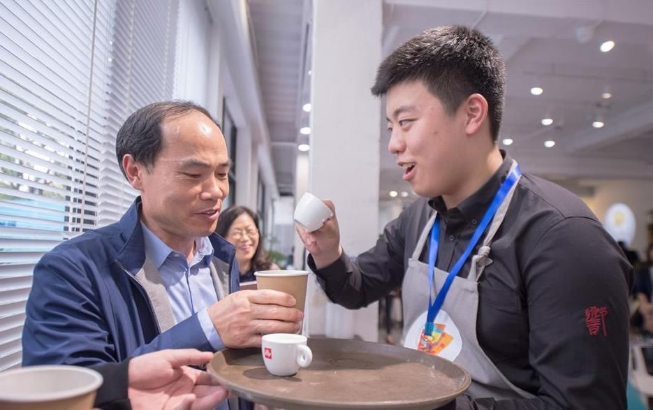 A staff worker at A Coffee serving coffee to a volunteer customer. /Shanghai Daily Photo