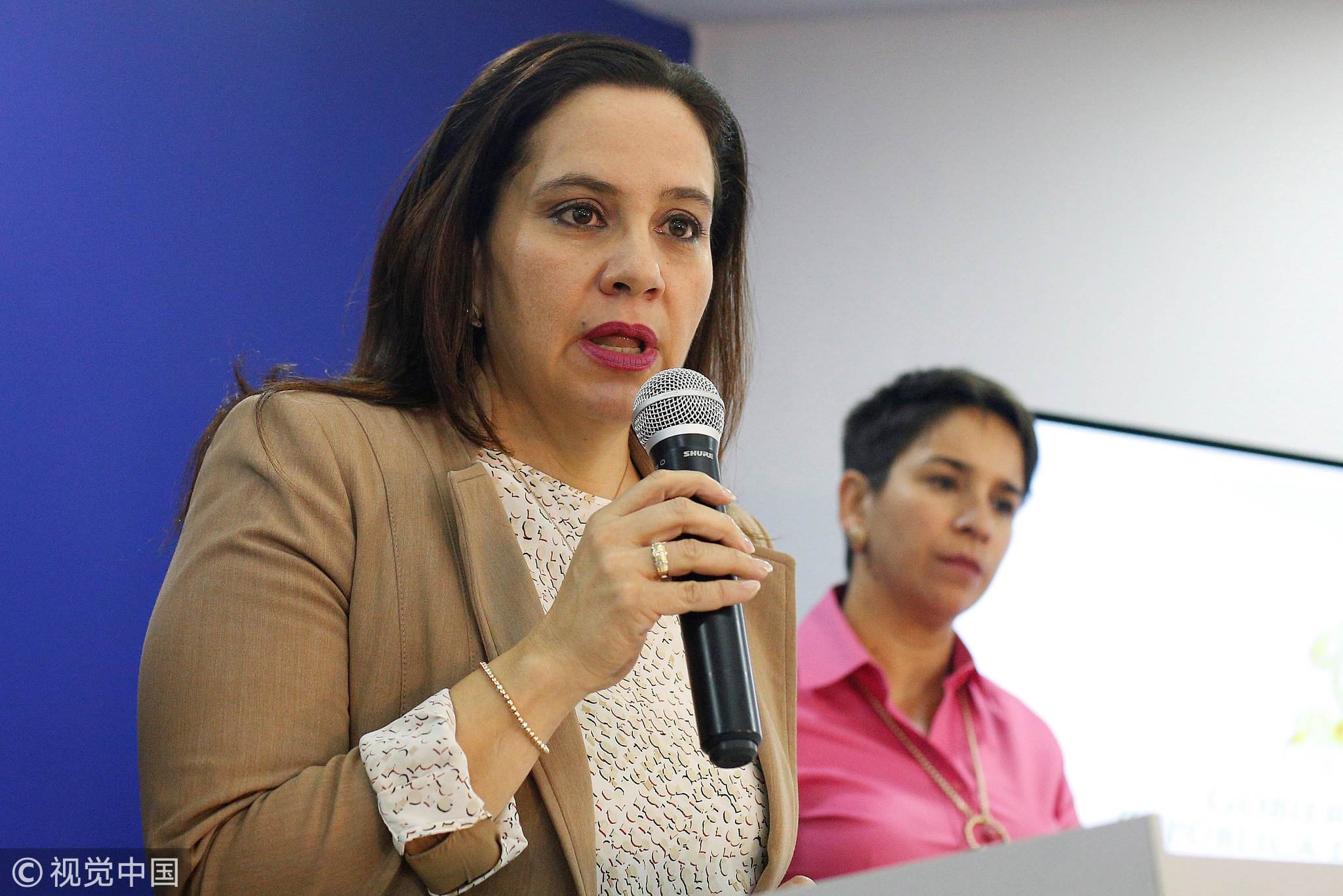 Honduras' first lady Ana Garcia de Hernandez delivers a message following the decision by US President to shut down TPS for Hondurans, at the Presidential House in Tegucigalpa, Honduras, May 4, 2018. /VCG Photo