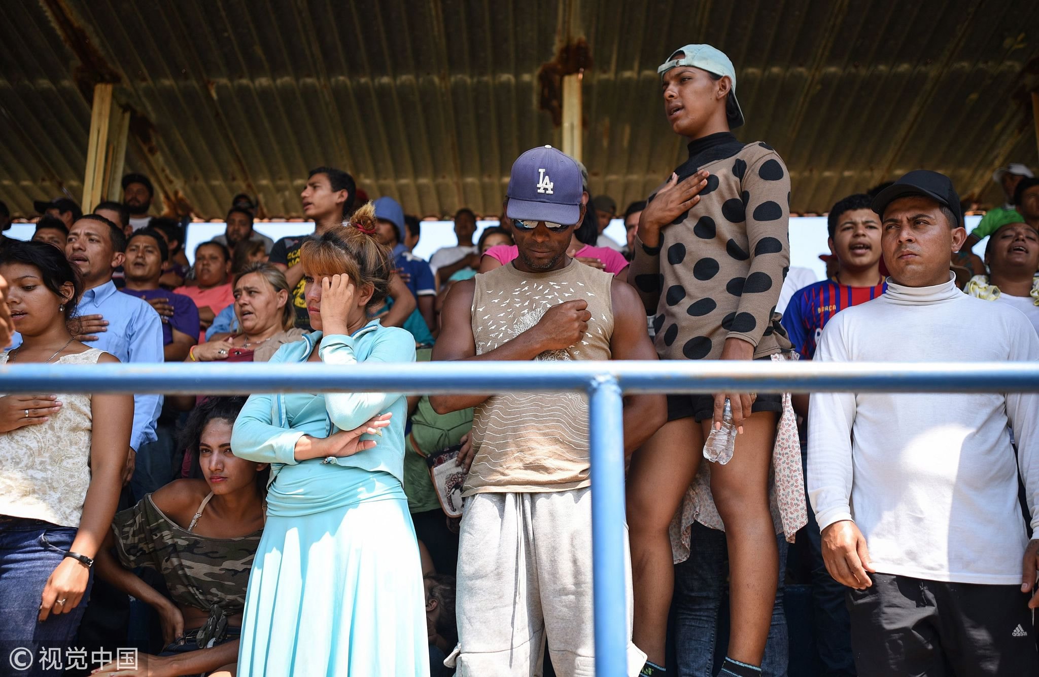 Hondurans sing their national anthem as they rest with other Central Americans who are taking part in a caravan called "Migrant Viacrucis" in Matias Romero, Oaxaca, Mexico, April 2, 2018. /VCG Photo