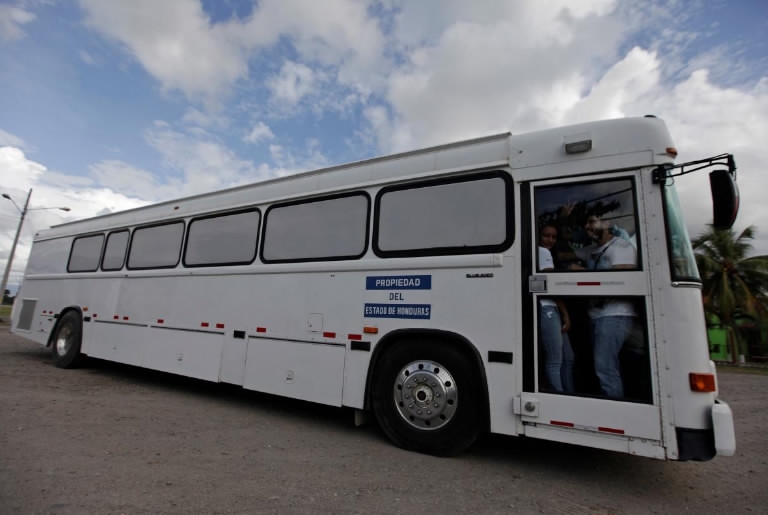 July 14, 2014: A bus carrying deportees from the US leaves the international airport in San Pedro Sula, northern Honduras. /Reuters Photo