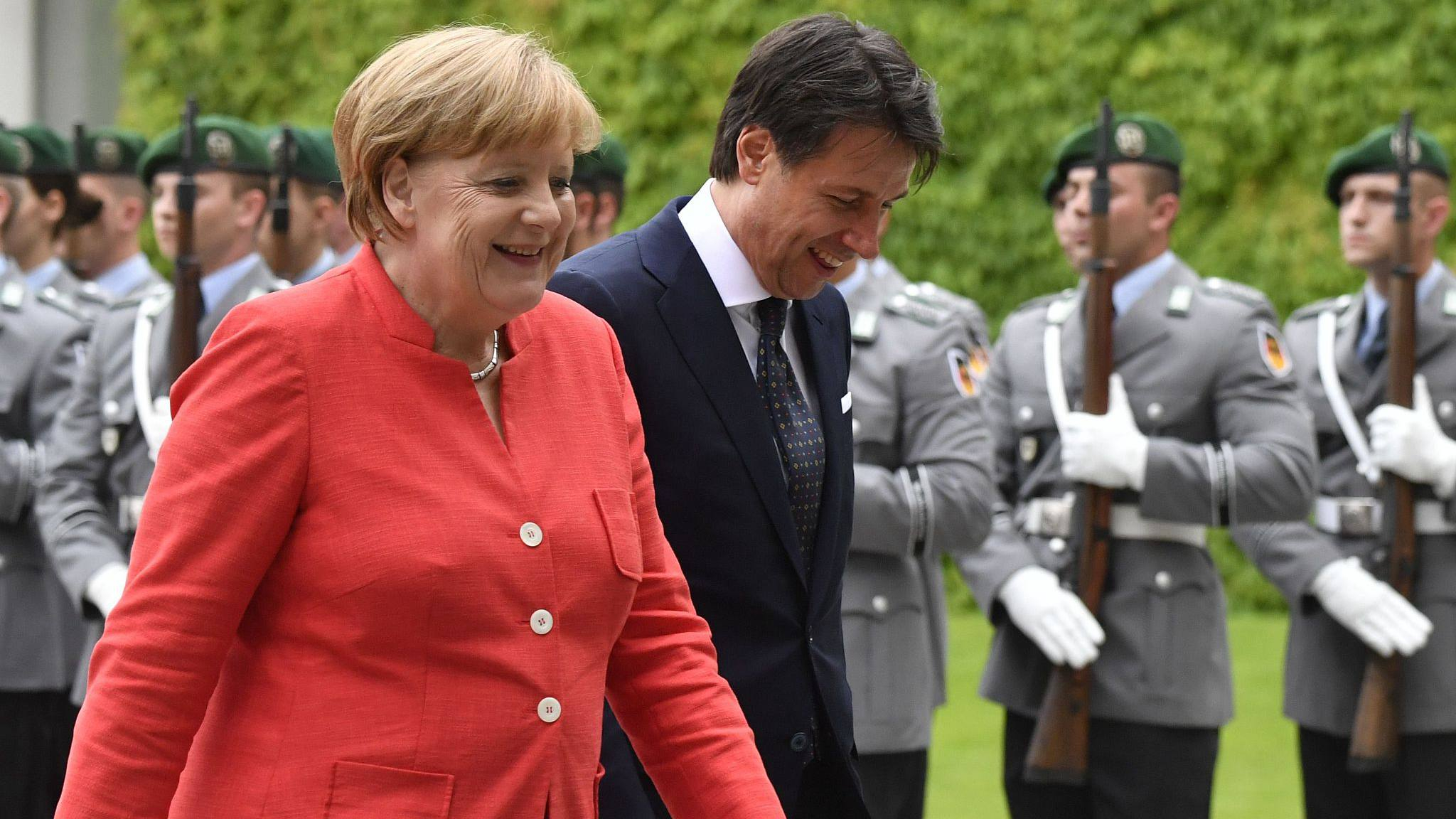 German Chancellor Angela Merkel (L) and Italian Prime Minister Giuseppe Conte talk as they review the honor guard during a welcoming ceremony in Berlin, June 18, 2018. /VCG Photo