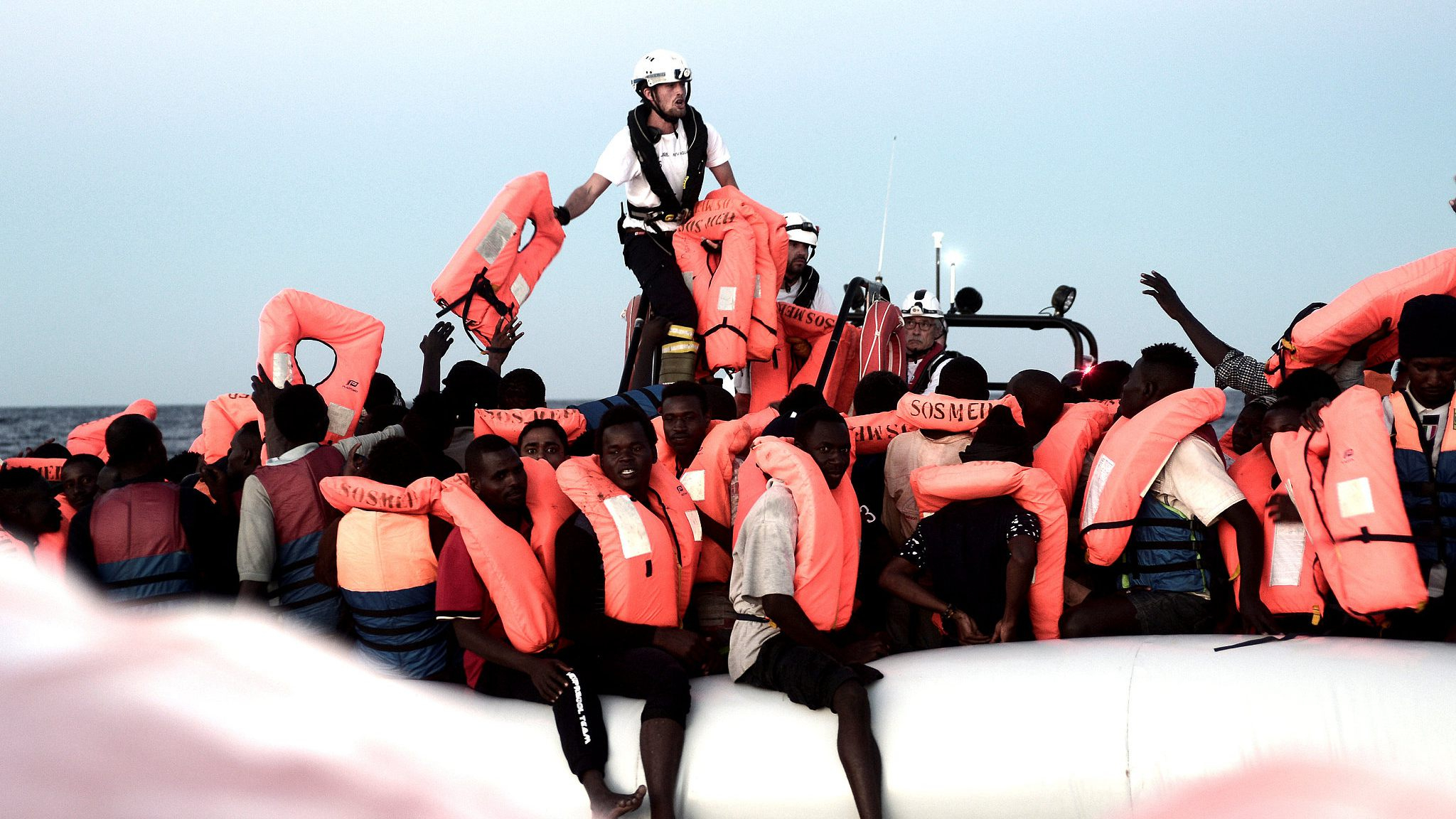 Migrants are rescued by staff members of the MV Aquarius, a search and rescue ship run in partnership between SOS Mediterranee and Medecins Sans Frontieres in the central Mediterranean Sea, June 9, 2018. /VCG Photo