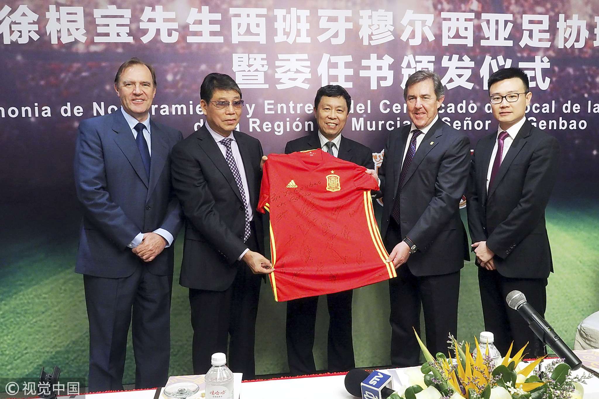 Xu Genbao signs for Spain's Murcia Football Association as member of council, April 28, 2016. /VCG Photo