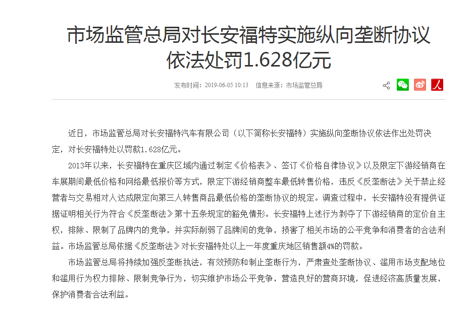 China's market regulator said that the joint venture had been setting a minimum resale price for its cars, which deprived dealers of pricing autonomy, in the municipality of Chongqing.