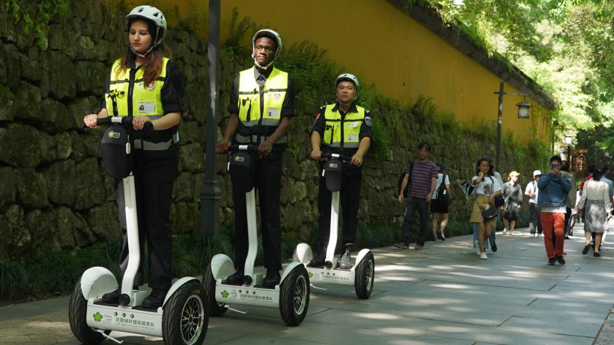 The presence of eight international students, who work as public aid volunteers at a major tourist spot in Hangzhou, capital of east China's Zhejiang Province, has caught the attention of tourists during the recent May Day holiday.