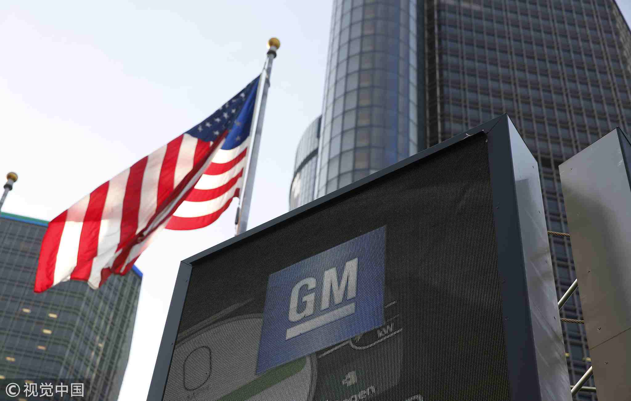June 12, 2018: An American flag flies near General Motors Co. signage outside the company's Renaissance Center world headquarters complex in Detroit, Michigan, US. /VCG Photo