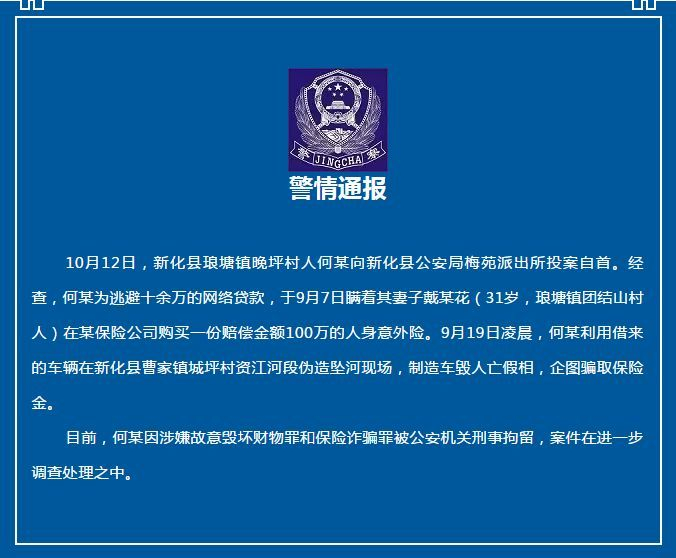 On October 10, his 31-year-old wife, surnamed Dai, drowned herself along with their 4-year-old son and 3-year-old daughter after posting a suicide note on messaging app WeChat. Police in Xinhua County found them in a pond near their home the next day.