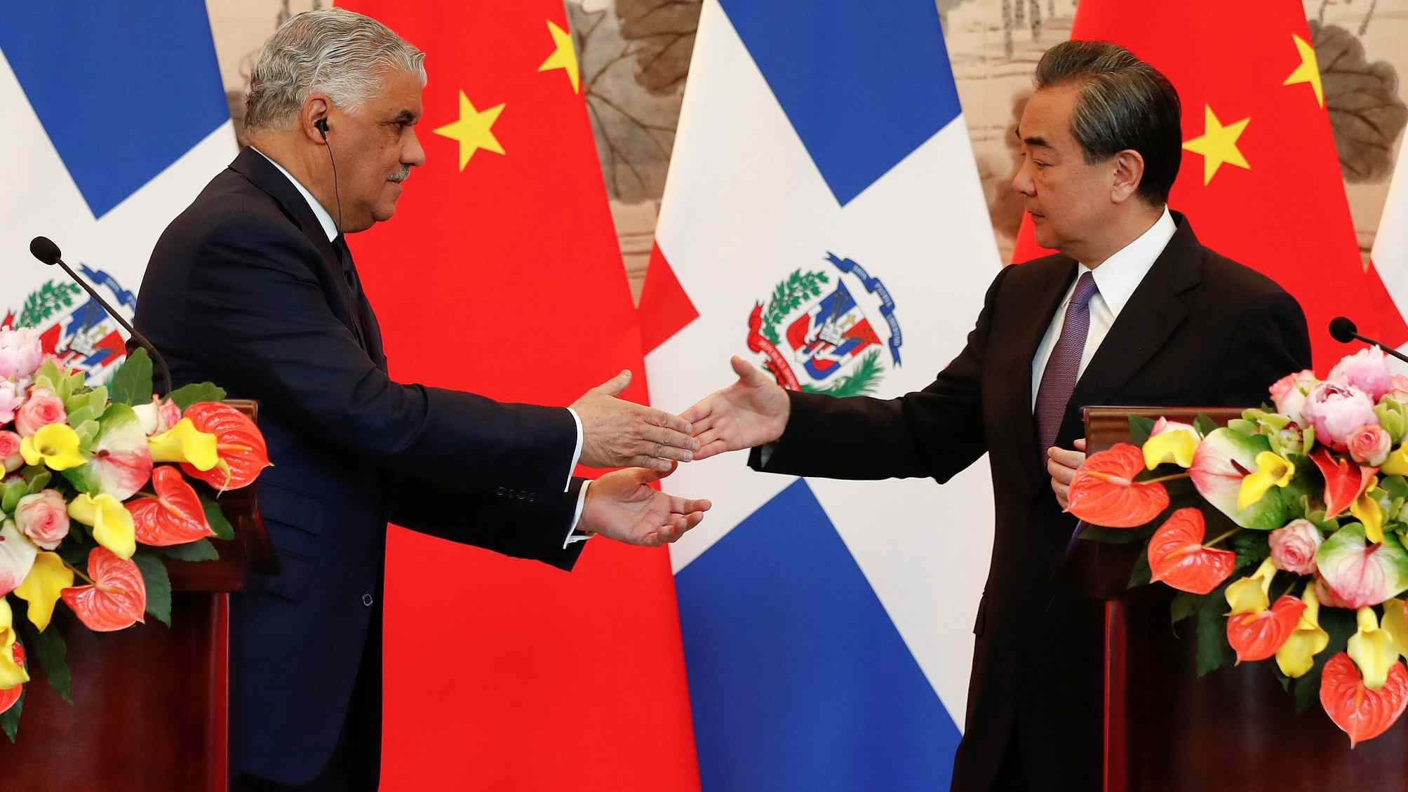 China's State Councilor and Foreign Minister Wang Yi shakes hands with the Dominican Republic's Chancellor Miguel Vargas during a signing ceremony in Beijing, China, May 1, 2018. /VCG Photo