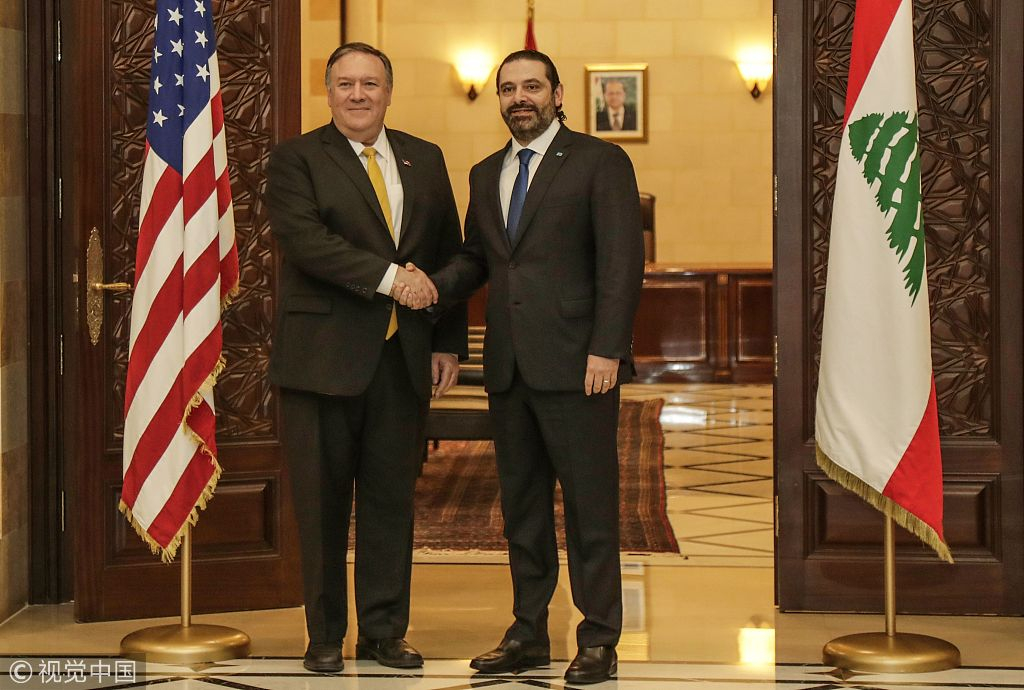 U.S. Secretary of State Mike Pompeo (L) shakes hands with Lebanon's Prime Minister Saad Hariri (R) in Beirut on March 22, 2019. /VCG Photo