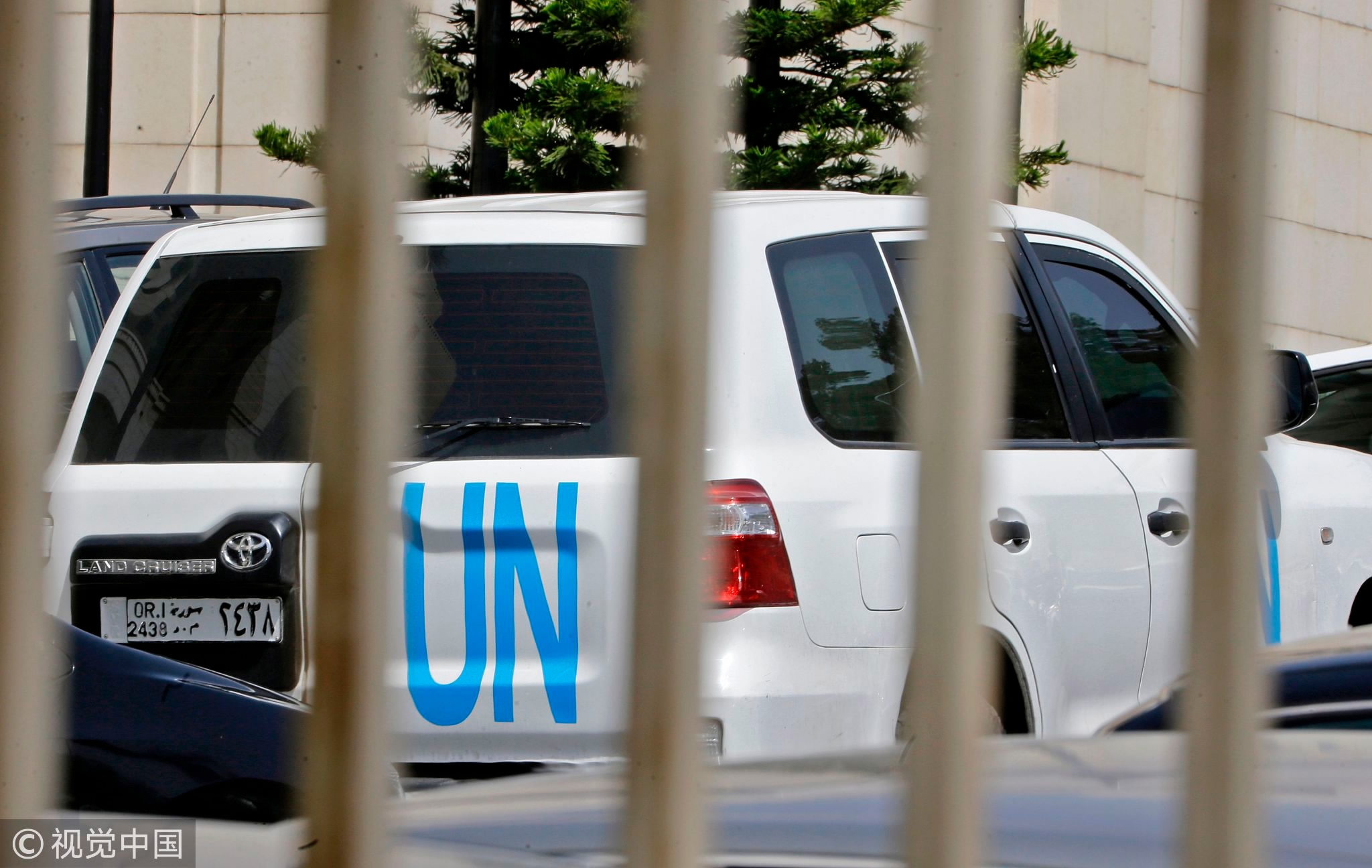 United Nations vehicles are seen outside the hotel where the international experts from the Organisation for the Prohibition of Chemical Weapons (OPCW) are staying in Damascus on April 19, 2018. /VCG Photo