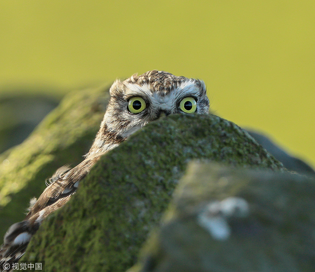 A cheeky owl plays "peekaboo" with a British wildlife photographer Wayne Havenhand, 51, who spent over an hour trying to capture this perfect picture on Wednesday. / VCG Photo