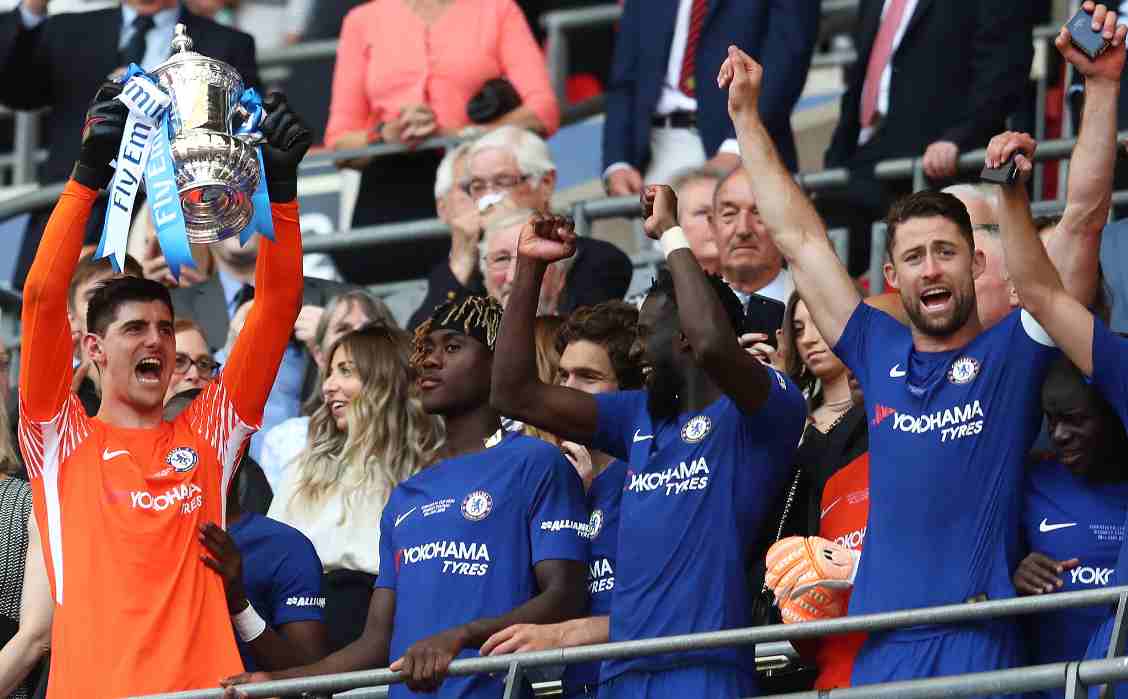 Thibaut Courtois (L) lifts the Emirates FA Cup trophy at Wembley Stadium on May 19, 2018. /VCG Photo