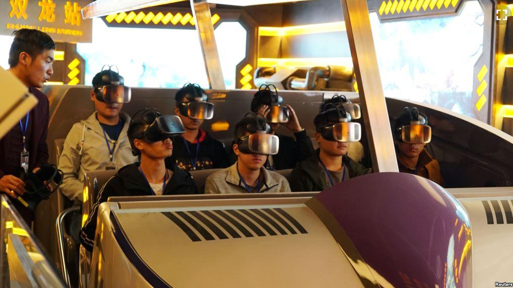 Staff members wearing virtual reality goggles sit in a motorized cart while performing an inspection of the attraction "Fly Over Guizhou," at the Oriental Science Fiction Valley theme park in Guiyang, Guizhou Province, southwest China, Nov. 16, 2017. / Reuters
