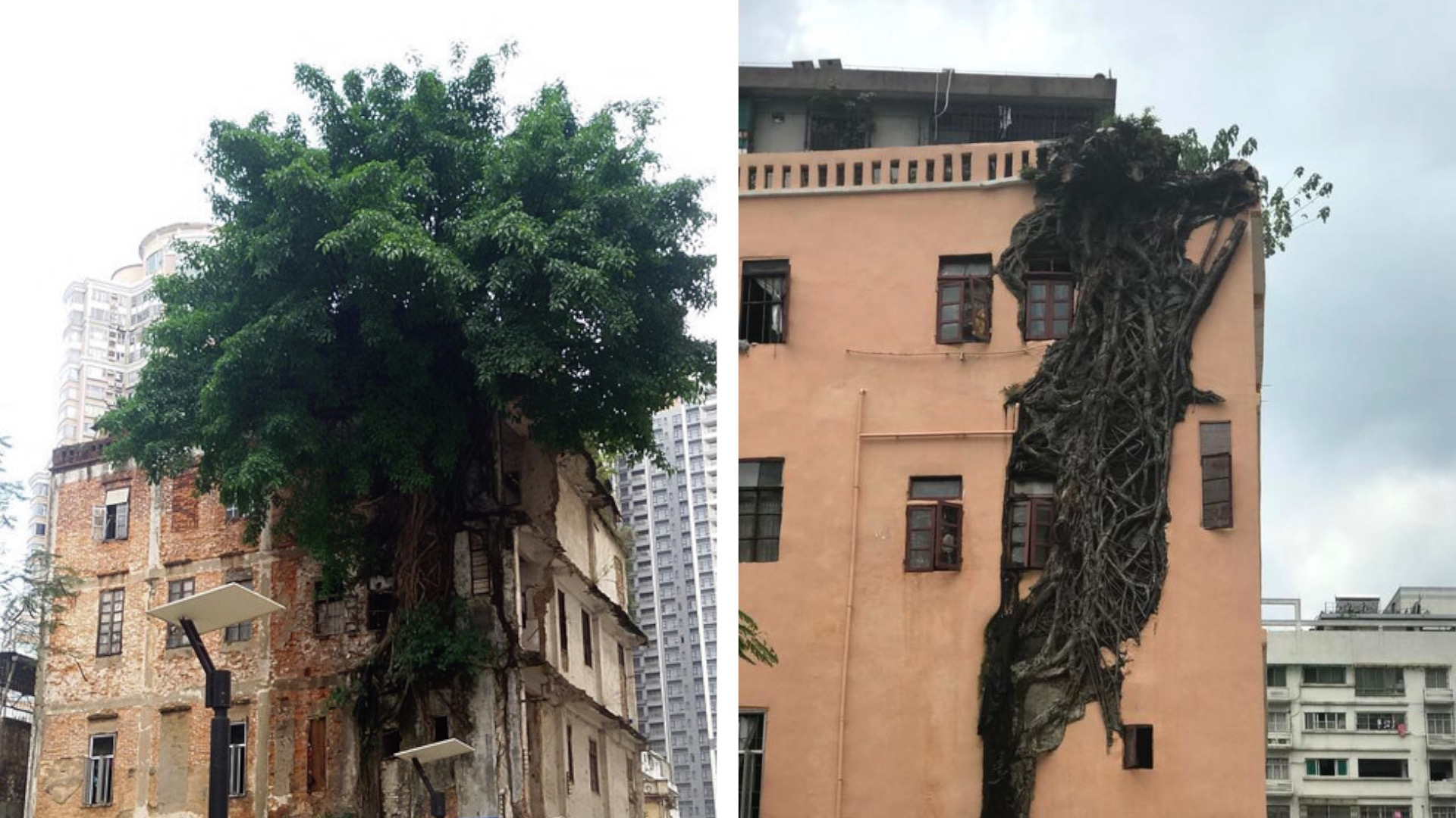 A huge banyan tree grows while attached to a four-story residential building for over 40 years in Guangzhou City, south China' Guangdong Province.