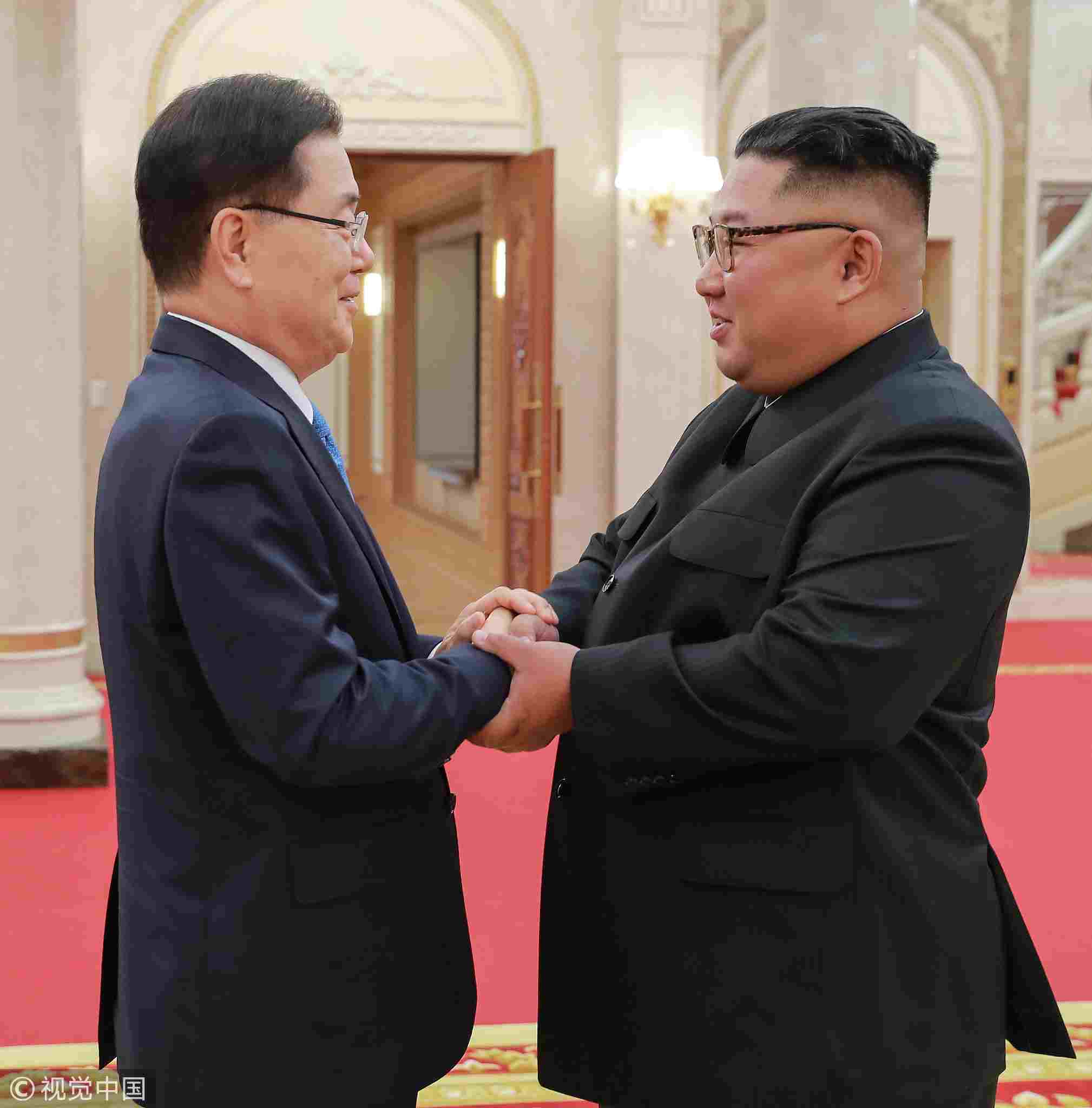 DPRK leader Kim Jong Un (R) shakes hands with ROK president's special envoy Chung Eui-yong in Pyongyang, September 5, 2018. /VCG Photo