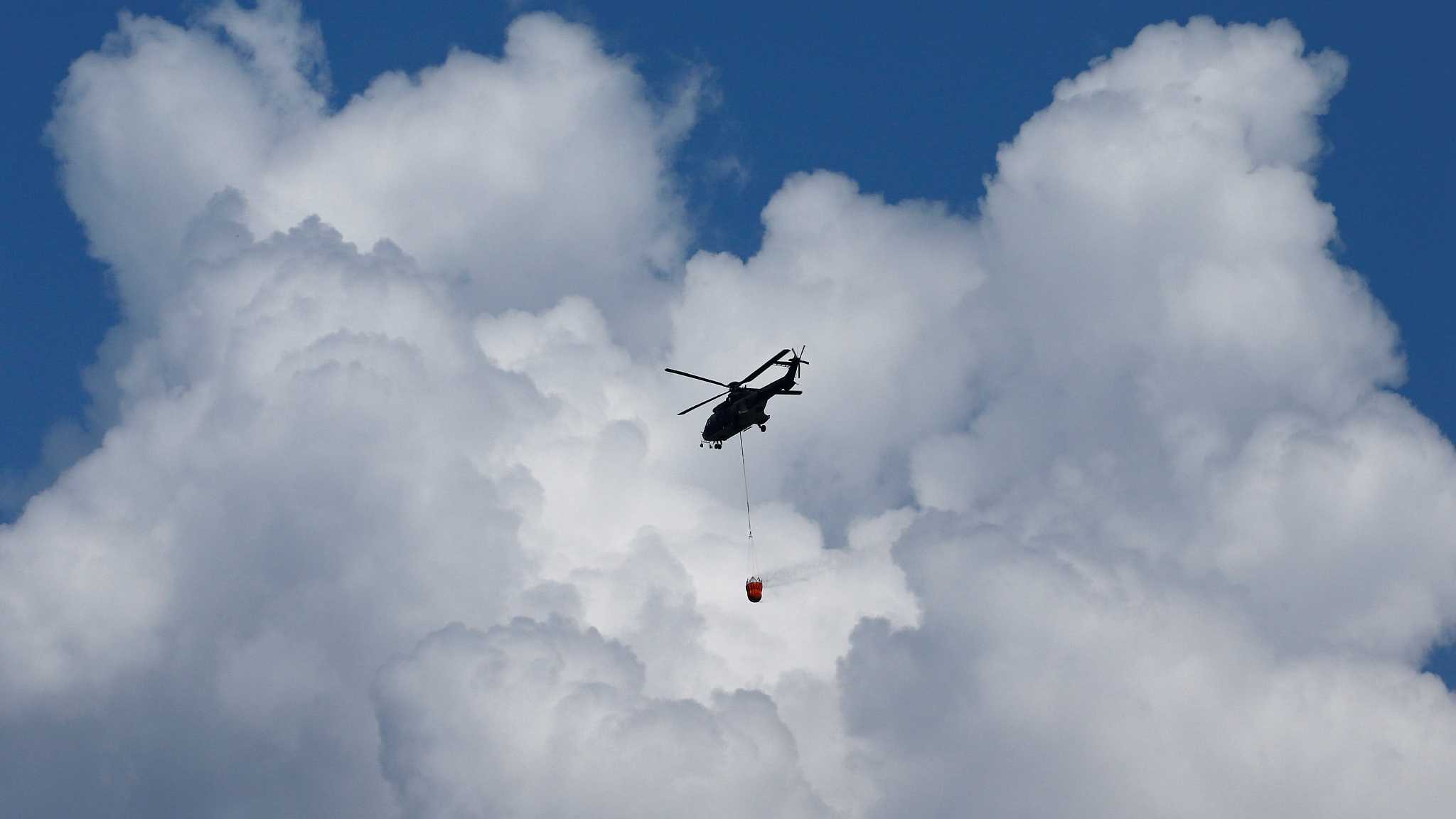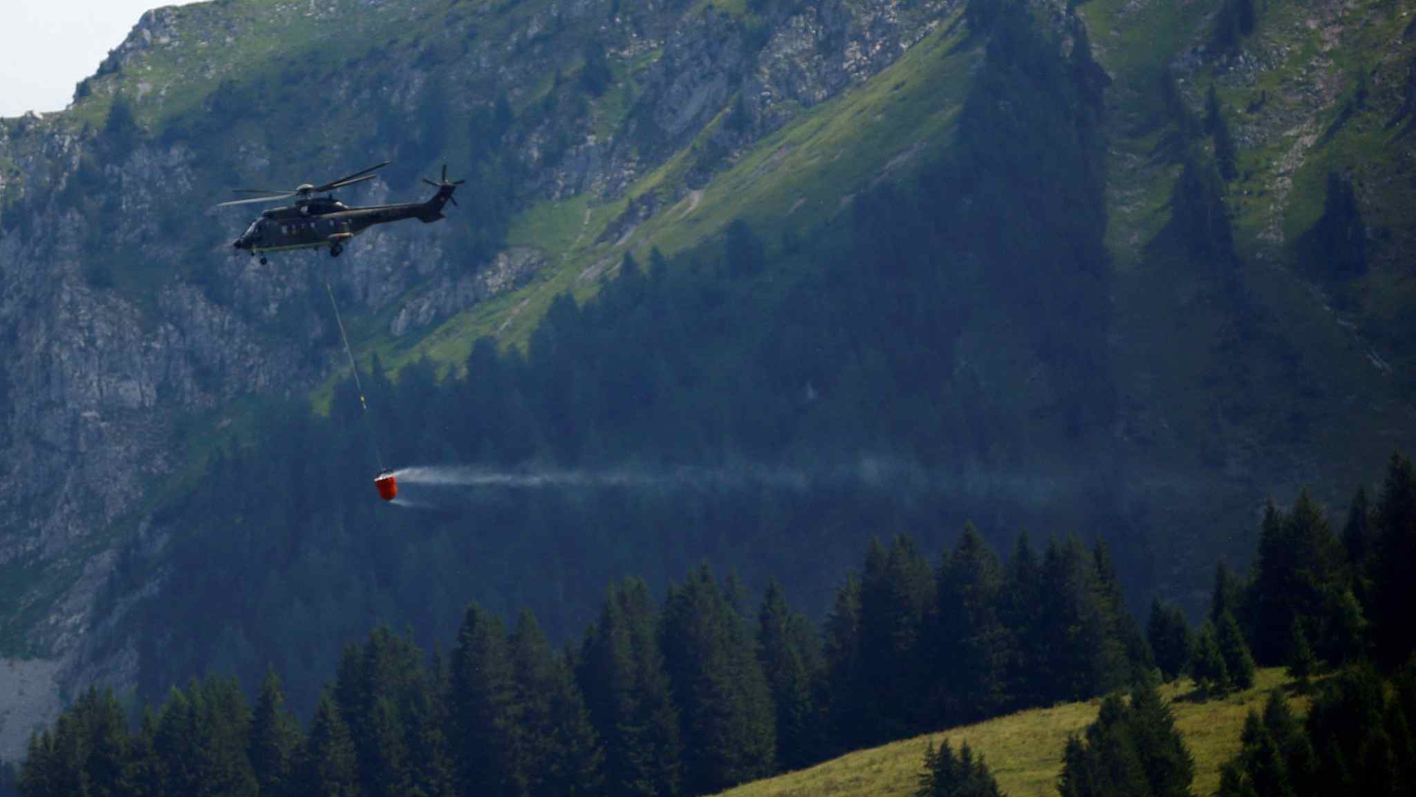 An Air Force Super Puma helicopter airlifted on Tuesday water to cows in drought-stricken areas near Chateau d'Oex in Switzerland amid rising temperatures. /VCG Photo