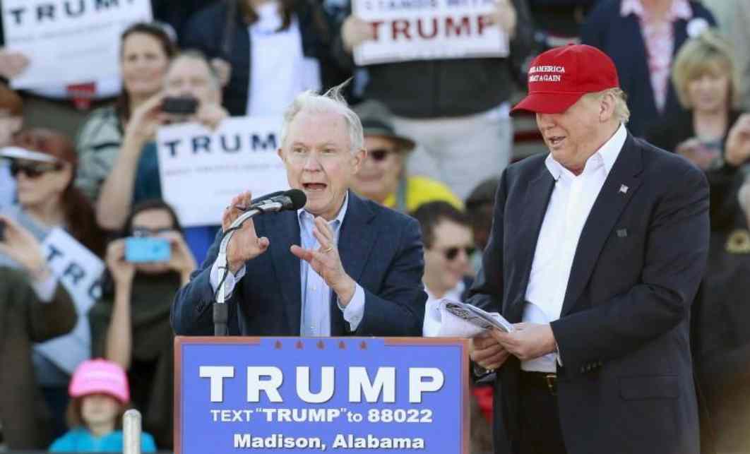 Senator Jeff Sessions speaks next to Republican presidential candidate Donald Trump at a rally at Madison City Schools Stadium in Madison, Alabama on Feb. 28, 2016. /Reuters Photo
