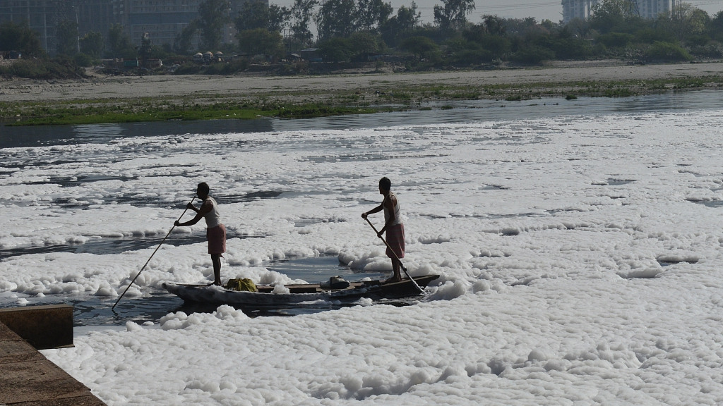 Parts of Yamuna River were covered by a thick layer of foam, which described as a "dead river" because the river does not have enough oxygen for fish or any river life to survive. /VCG Photo