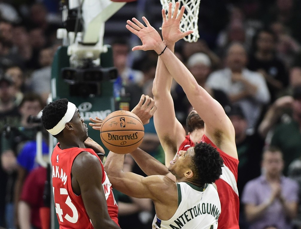 Giannis Antetokounmpo (C) drops the ball under the defense of two Raptors players in the game, May 23, 2019. /VCG Photo