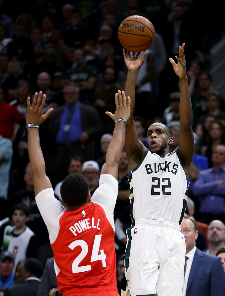 Khris Middleton #22 of the Bucks shoots in the game against the Raptors, May 23, 2019. /VCG Photo
