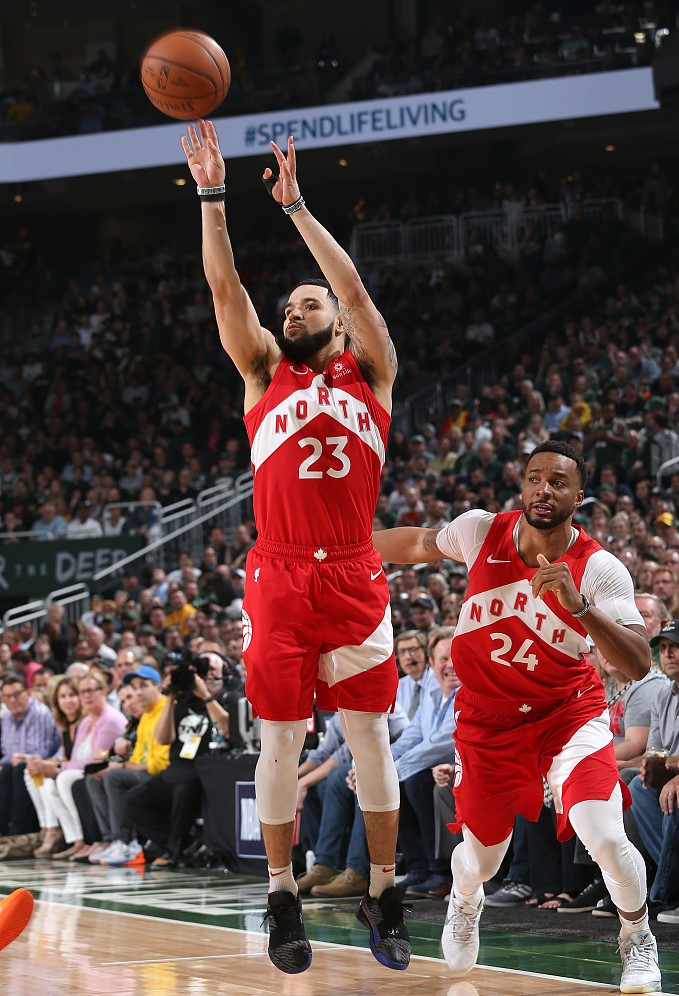 Fred VanVleet #23 of the Toronto Raptors shoots a 3-pointer in the game they win against the Milwaukee Bucks 105-99 at the Fiserv Forum, May 23, 2019. /VCG Photo