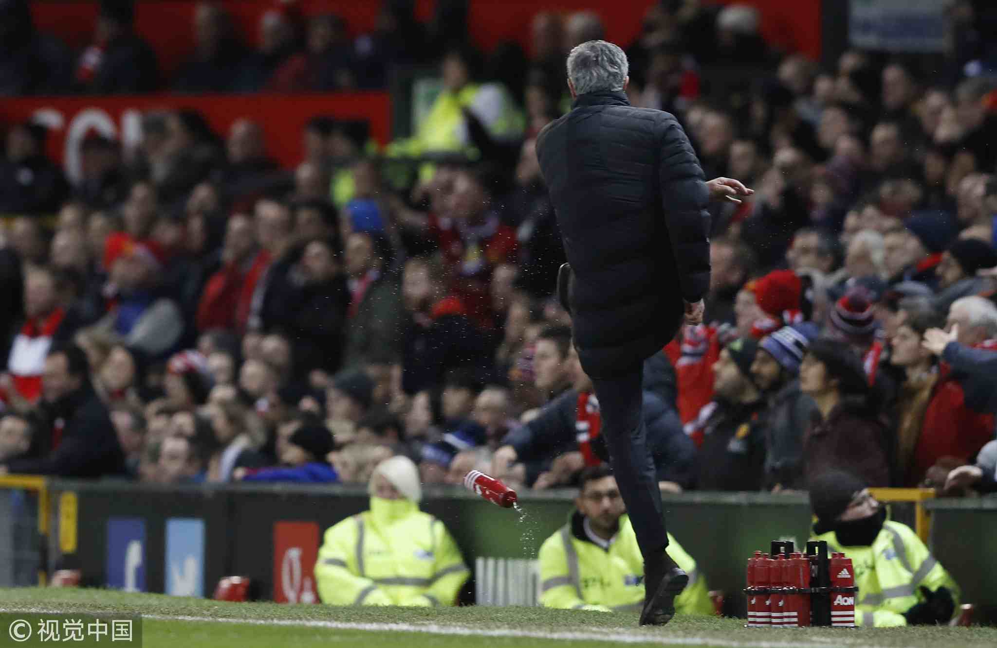 November 27, 2016: Manchester United manager Jose Mourinho kicks a water bottle at Old Trafford. /VCG Photo