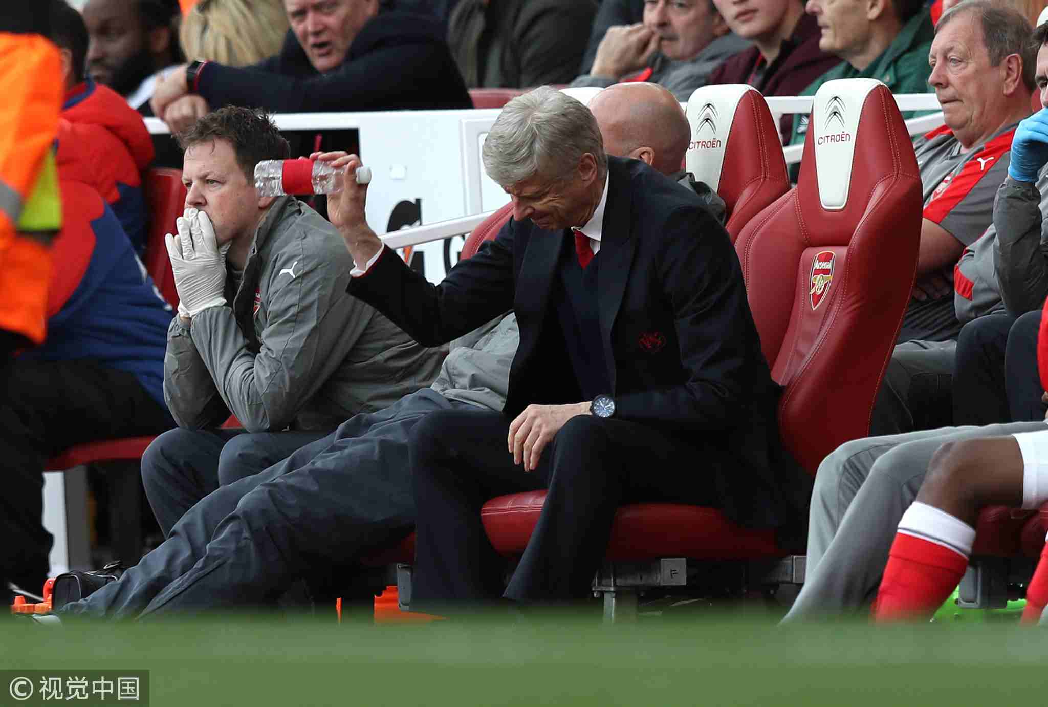 April 2, 2017: Arsenal manager Wenger slams his bottle down as Manchester City's Sergio Aguero scores his side's second goal of the game. /VCG Photo