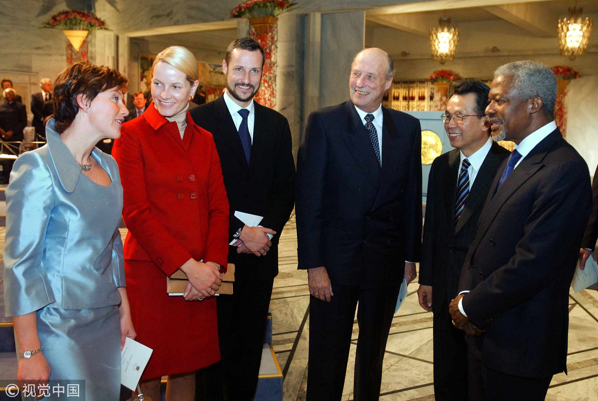 The Royal Norwegian family meet Nobel Peace Prize winner Kofi Annan (R) and South Korean Foreign Minister Han Seung-soo (2nd L), who accepted the prize on behalf of the UN in Oslo, 10 December 2001. /VCG Photo