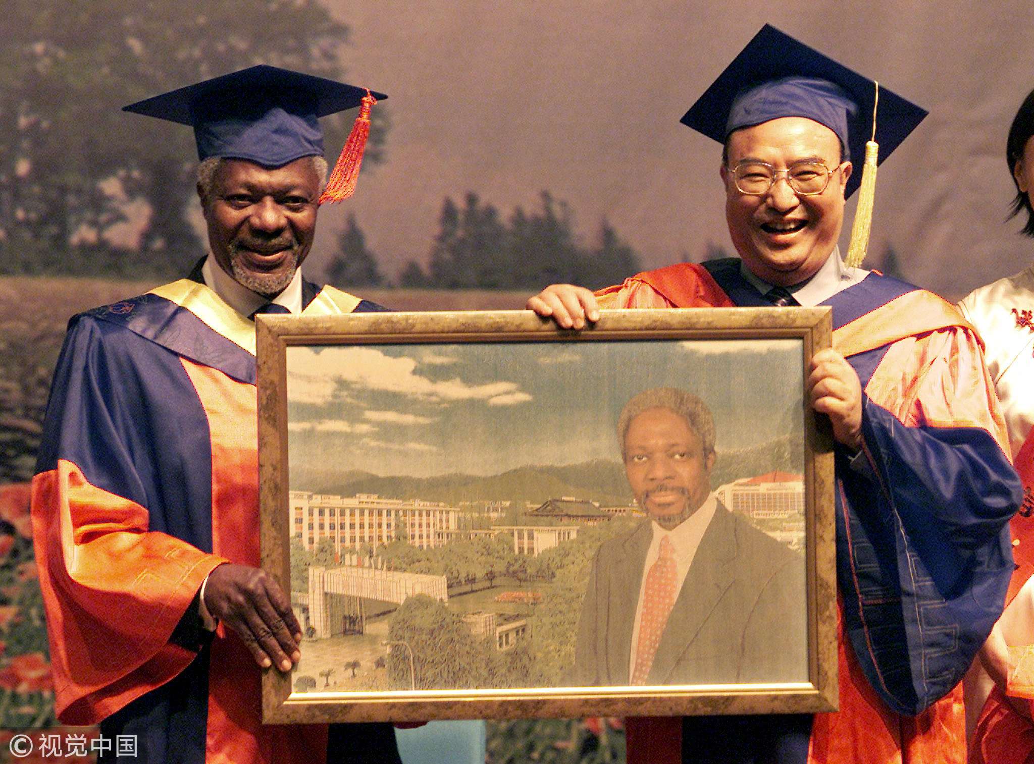 United Nations Secretary-General Kofi Annan receives a portrait from Zhang Junsheng (R), secretary general of the Communist Party Zhejiang Committee after he was conferred with an honorary doctorate degree at Zhejiang University in Hangzhou, October 14, 2002. /VCG Photo.