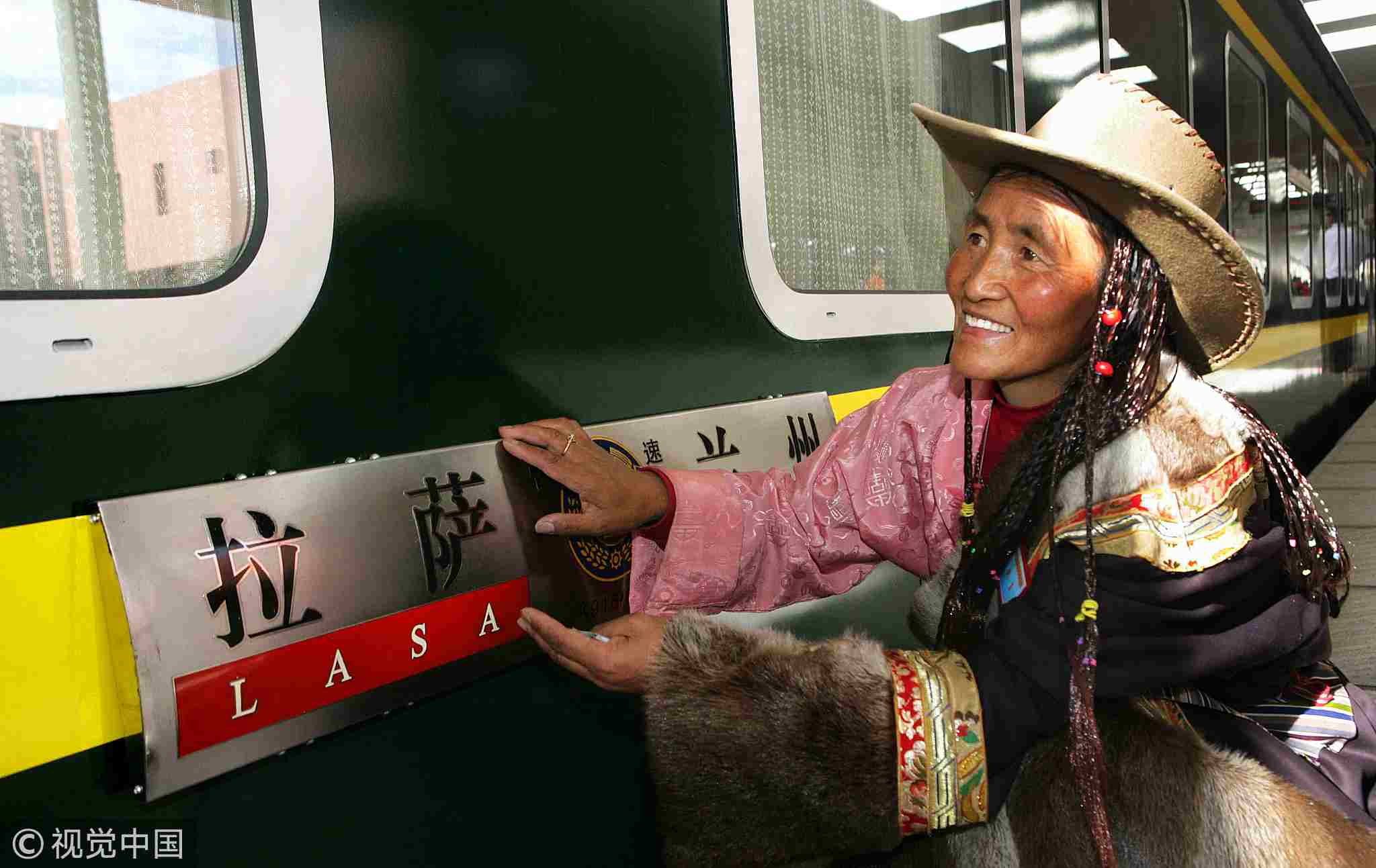 A Tibetan lady strokes the plate that shows departure and arrival stations, excited to see the first train on the Qinghai-Tibet Railway to start from Lhasa, July 1, 2006. /VCG Photo