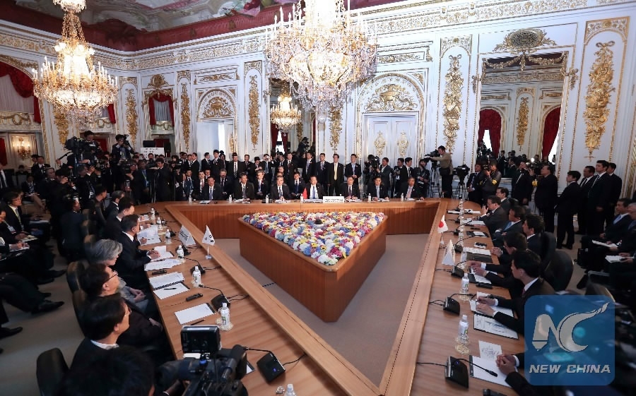 Chinese Premier Li Keqiang, Japanese Prime Minister Shinzo Abe and ROK President Moon Jae-in attend the 7th China-Japan-ROK leaders' meeting in Tokyo, Japan, May 9, 2018. /Xinhua Photo