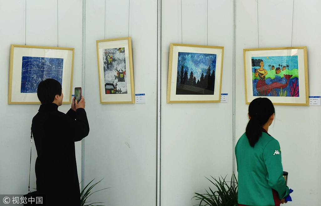 Visitors at the art exhibition of works finished by children with autism at Hangzhou, China. April 2, 2019. /VCG Photo