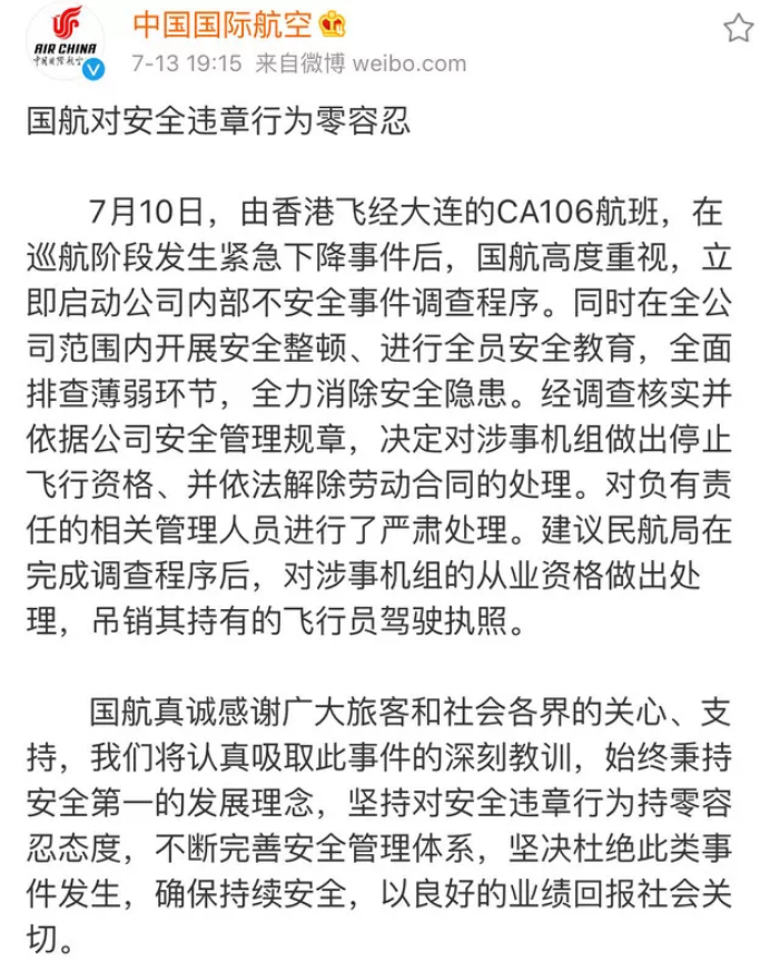 Flight CA106, with 153 passengers and nine crew members on board, was on its way from Hong Kong to northeast China's Dalian City on July 10 when it lost air pressure mid-flight and made an emergency descent.