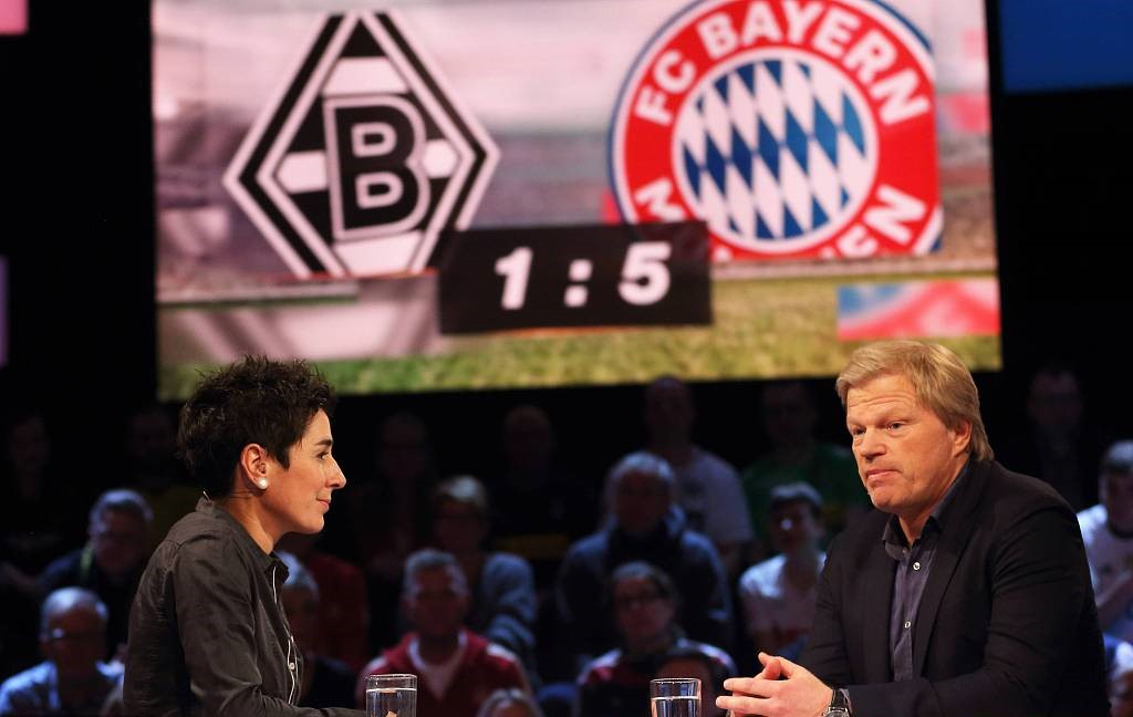 Oliver Kahn (R) comments on a Bayern Munich's game on TV. /VCG Photo
