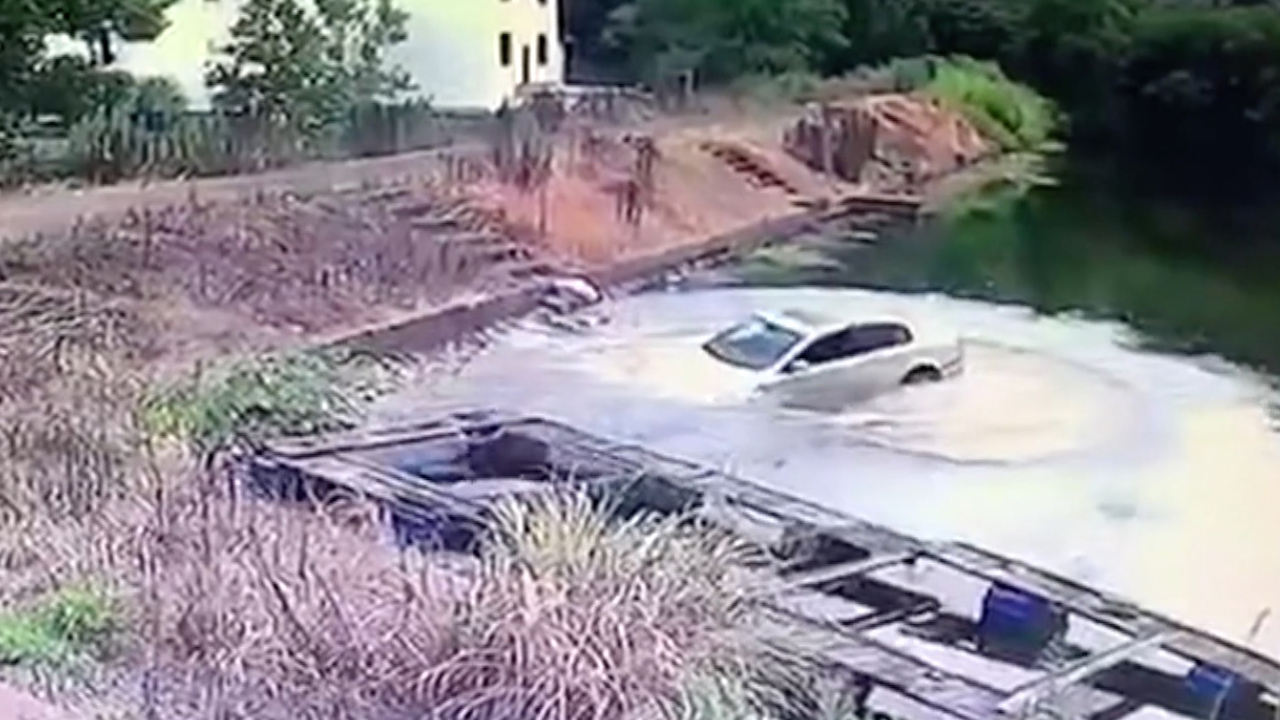 Footage shows a car suddenly rolling backwards into a reservoir as the driver attempts to make a U-turn. The driver can be seen clambering out of the vehicle through the driver side's window and swimming to shore.