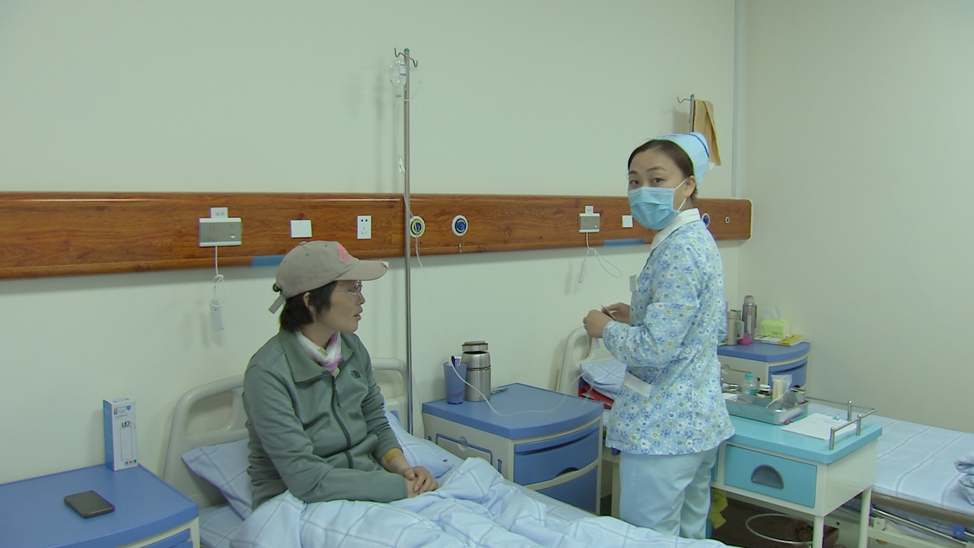 Lung cancer patient Cheng Jing takes chemotherapy injection in hospital. /CGTN Photo
